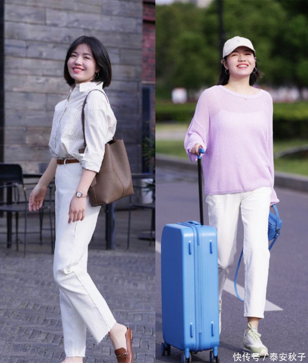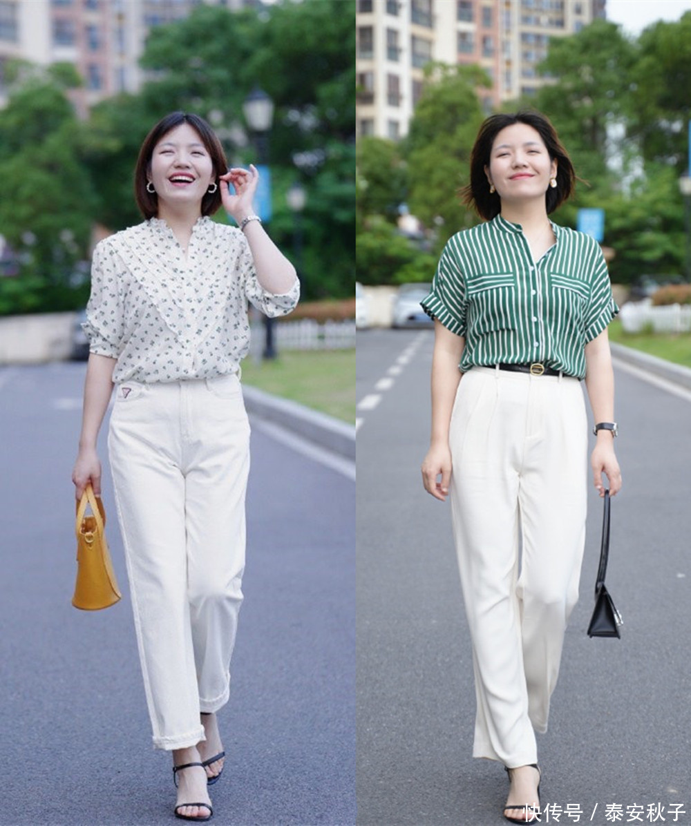 最佳就连合高腰的白色裤子搭配,眼下也可以去配上高跟鞋,再加上塞衣角可以修饰比例,闲适开松就增高显瘦了。
